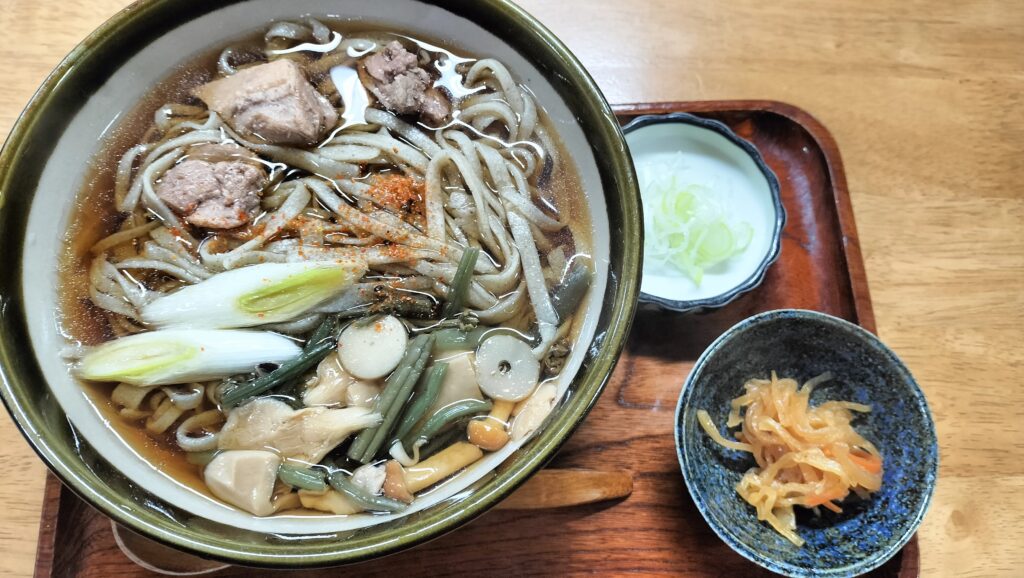 この日の昼食は「かもそば」を注文。運ばれてきた丼には、鴨肉とともにわらび、なめこ、しめじなどの山菜がたっぷり。つゆはやや濃いめで、鴨のうま味がしっかりと感じられ、体の芯から温まる味わいでした。そばは太めでコシがあり、素朴ながらも食べごたえがあります。