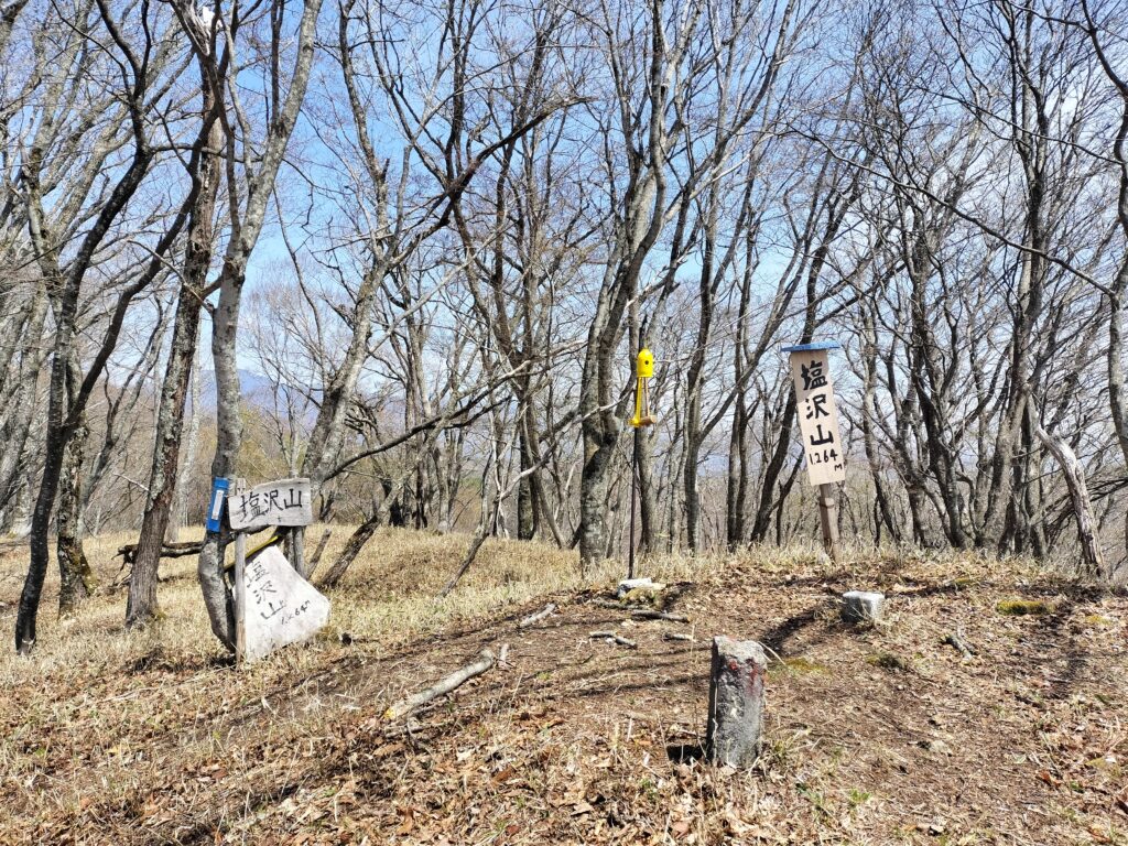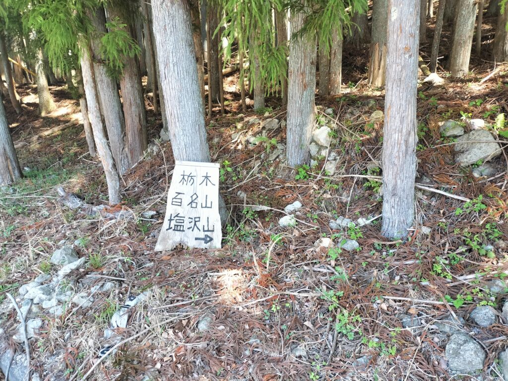 手書きの「栃木百名山 塩沢山」の看板が目印で、初見だと見落としやすいポイントです。