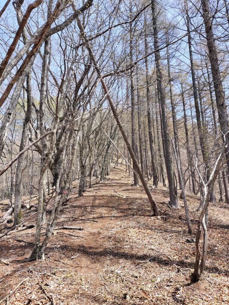 登りきると尾根に出て、道も比較的分かりやすくなります。このあたりは歩いていて気持ちのいい区間です。