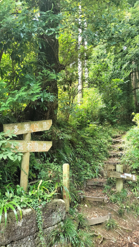 案内板のある分岐を左に進むと、山頂へと続くルート。右へ行けば多気不動尊の境内へ向かいます。整備された登山道は緩やかで、初心者でも安心して歩けます。