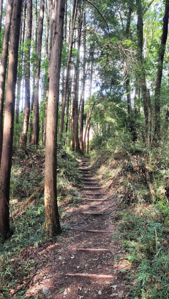 杉林の中を抜けると、木漏れ日が差し込み、鳥の声が響く静かな道になります。舗装路ではないものの、階段や踏み固められた土の道が続き、スニーカーでも問題ありません。