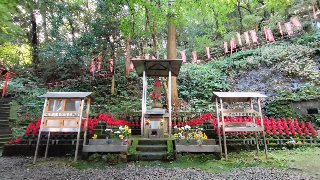 さらに下ると、水子供養地蔵尊が並びます。赤い前掛けをつけた地蔵たちが整然と立ち並び、手を合わせる人の姿がありました。昭和五十三年(1978年)に建立されたもので、いまも多くの参拝者が花や灯を手向けに訪れています。
