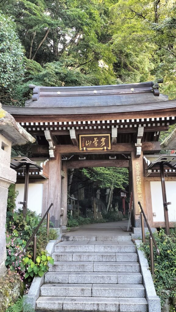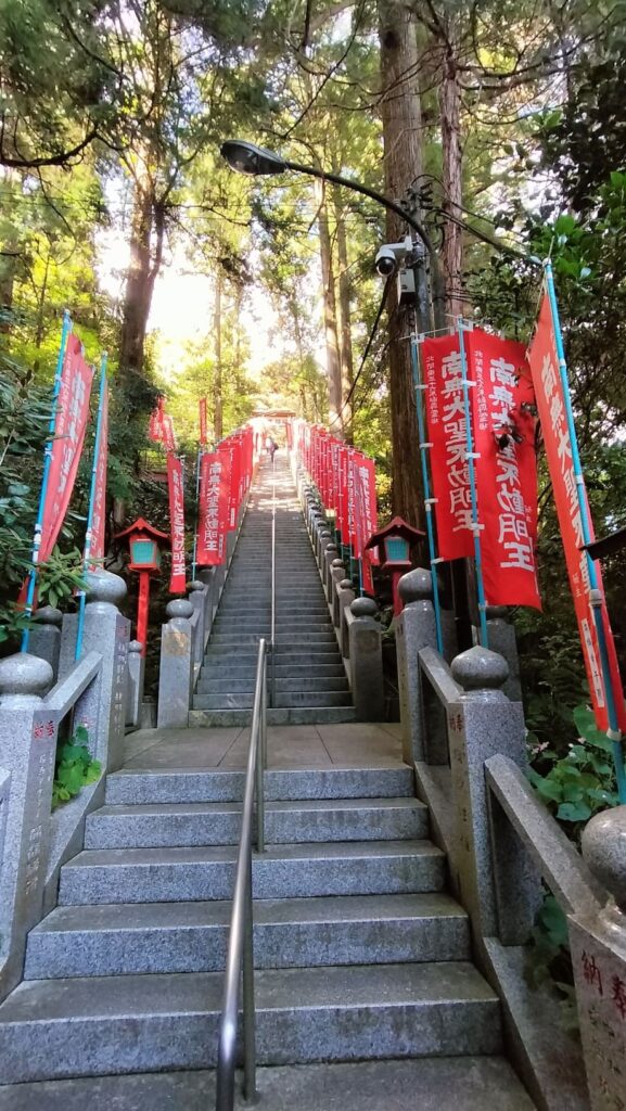 本堂へと続く石段には、赤い幟(のぼり)が整然と並び、緑の木々とのコントラストが見事でした。風が吹くたびに幟が揺れ、陽の光が差し込むと、朱と緑がきらめき合う美しい光景になります。