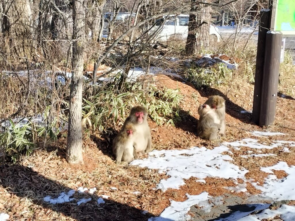 三本松(さんぼんまつ)でバスを降り、歩き始めてすぐの駐車場付近でニホンザルの群れに出会いました。冬の戦場ヶ原は静かな印象が強いだけに、いきなり野生動物の姿を目にして、奥日光に来た実感が一気に高まります。