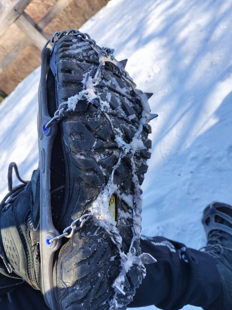 路面状況は「雪が深い」というより、「凍結している場所が点在する」状態です。こうしたコンディションでは、スノーシューよりも軽アイゼン(チェーンスパイク)が効果的だと感じました。凍った場所でも滑りにくくなり、足元への不安が大きく減ります。
