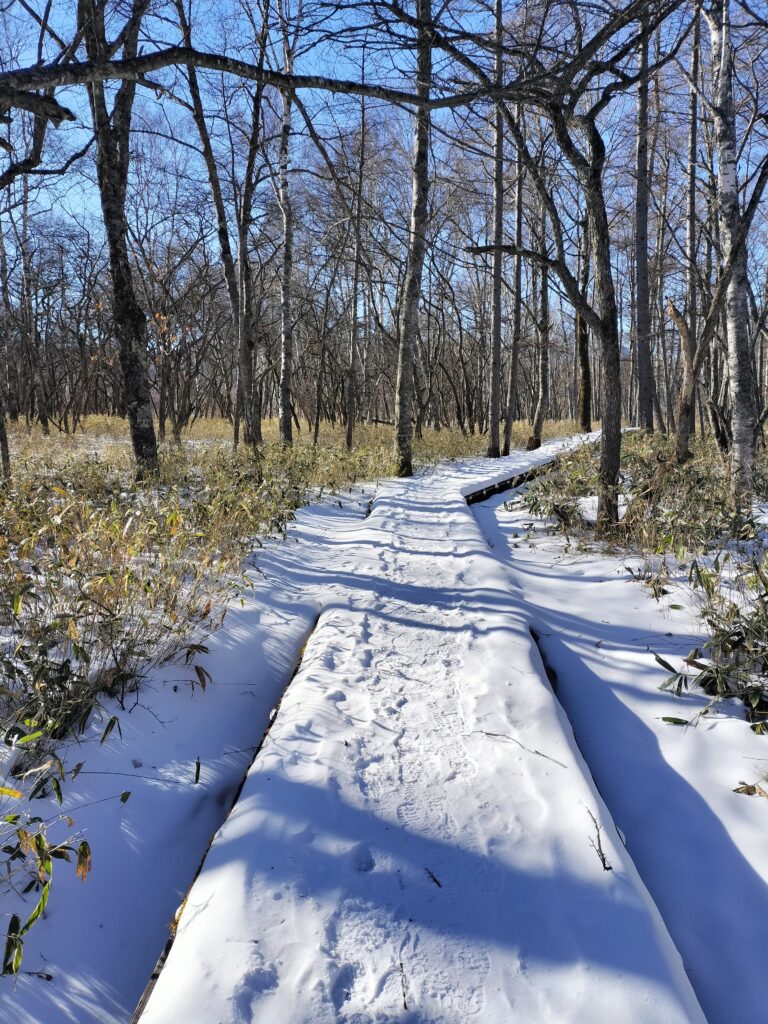 一方で、いちばん注意したいのが凍結です。踏み固められた雪道や木道の一部は凍っており、特に木道は平らなぶん滑りやすく感じました。雪が少ない年ほど凍結が目立ちやすいので、「雪がない=安全」と思わず、足元には常に気を配る必要があります。ペースを落として慎重に歩くことで、安心して散策できました。
