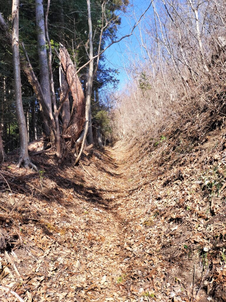 舗装路から一転し、落ち葉に覆われた静かな山道へ。人も少なく、冬の八溝山らしい落ち着いた雰囲気です。