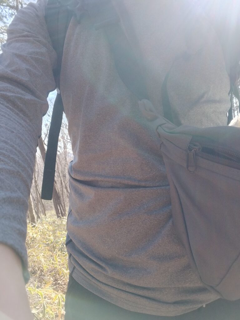 登山中の服装。歩くと体温が上がり、防寒は調整が必要です。