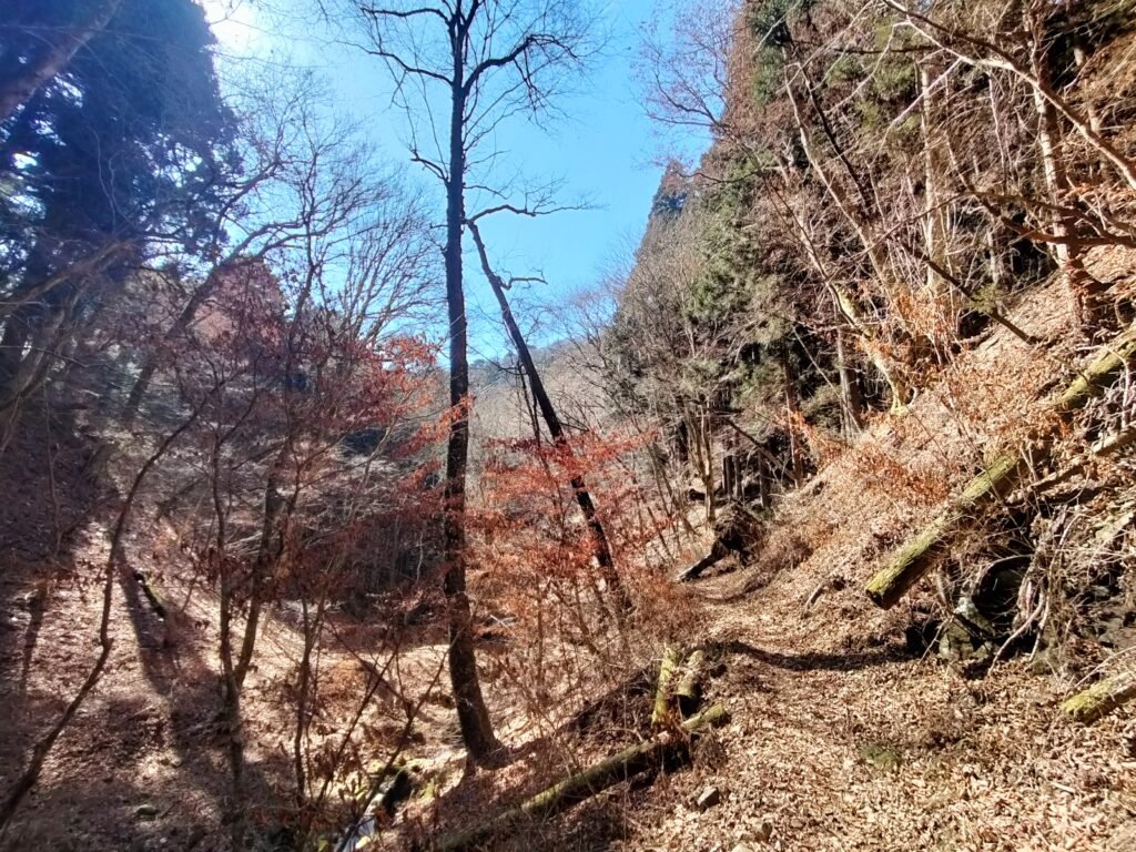 冬枯れの木々の間から光が差し込み、静かな山道が続きます。少し下ってから再び登り返し、日輪寺を目指します。八溝山は単調な直登ではなく、こうした起伏があるのが特徴です。