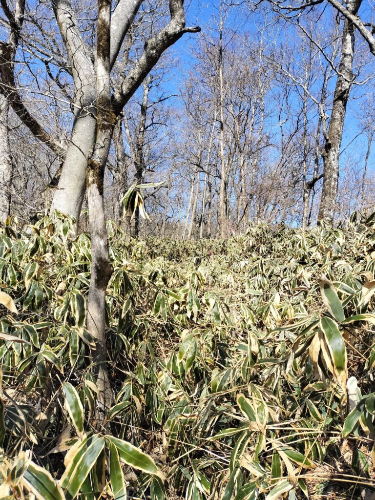 笹が広がる山頂直下の登山道。冬でも緑が残る区間です。