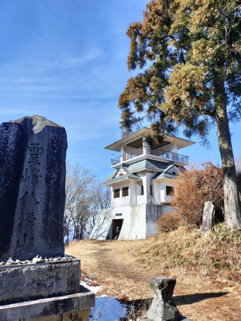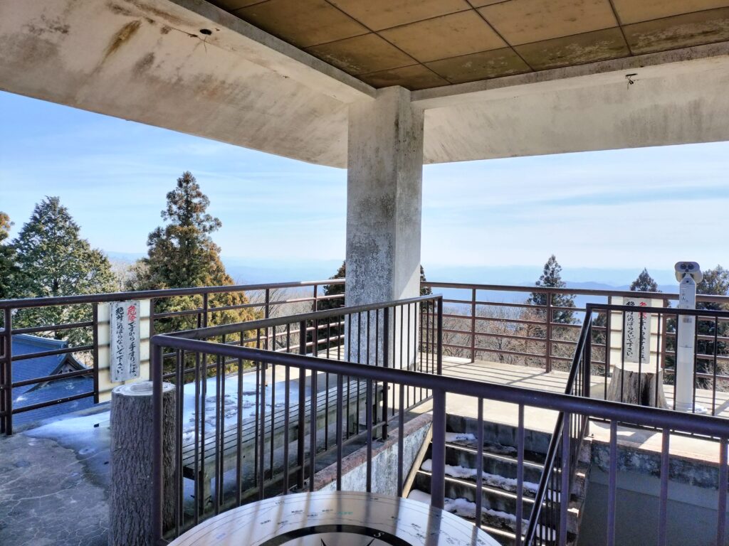 冬晴れの澄んだ青空と八溝山山頂の展望台を背景に、遠くにうっすらと那須連峰の雪山が見える構図。